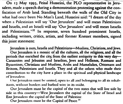 Manysolutions have been proposed and are being proposed to end theinterminal conflict between the Israelis and the Palestinians. Thecentral issue is Jerusalem. The best solution to this problem iscontained in Karen Armstrong's book entitled Jerusalem, One City,Three Faiths. The statement below was submitted by responsiblespokesmen from each side and indicates that historically Jerusalemdoes not belong to either, but to all those cultures who at one timeor another in the past occupied this territory.