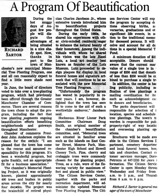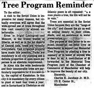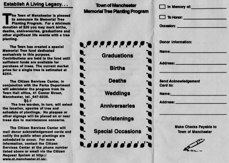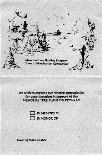 In the 1960'sI created a Memorial Tree Program for the town of Manchester,Connecticut. People were invited to send in a sum of money for whicha tree or a shrub would be planted. This could serve to memorializesomeone who had died or to honor a living person. The donor would beacknowledged by receiving a thank you card and having his or her namepublished in our local newspaper. The recipients family would alsoreceive notification of the gift. Hazel Lutz drew the art work forthe notices and made plaques to distribute throughout the town topublicize the program. I had noted similar programs in Camden, Maineand Memphis, Tennessee and thought Manchester could benefit from sucha program.